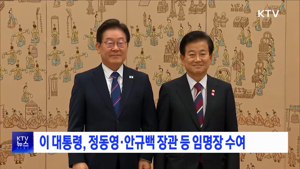 임보라 앵커>이재명 대통령이 용산 대통령실에서 신임 국무위원 4명과 국세청장에게 임명장을 수여했습니다.이 대통령은 정동영 신임 통일부 장관과 안규백 국방부 장관, 전재수 해양수산부 장관, 한성숙 중소벤처기업부 장관, 임광현 국세청장에게 임명장을 전달하며 축하한다, 잘 부탁한다고 격려했습니다.이번 임명장 수여식에는 최동석 인사혁신처장과 강훈식 대통령 비서실장...
