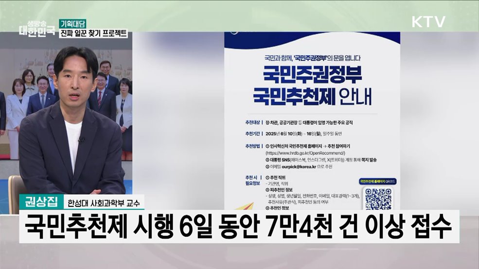 차현주 앵커>이재명 정부 출범과 동시에 국민이 직접 참여하는 '진짜 일꾼 찾기 프로젝트'를 가동하며, 국민과 함께하는 인사제도의 문을 열었습니다.국민추천제를 향한 뜨거운 열기 속 인사 추천에 이어 국민이 체감하는 '알짜 정책' 발굴을 위한 국민추천제도 실시했는데요.자세한 내용, 권상집 한성대 사회과학부 교수와 이야기 나눠보겠습니다.안녕하세요.(출연: 권상집...