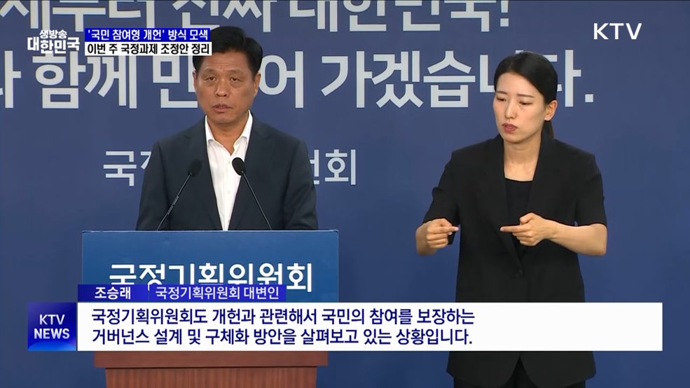 김용민 앵커>국정기획위원회가 개헌에 국민 참여를 보장하는 방식을 살펴보고 있다고 밝혔습니다.이재명 대통령이 제헌절이었던 지난 17일, '국민 참여형 개헌' 추진을 약속한 데 따른 후속 조치입니다.김현지 앵커>국정위는 한편 이번 주까지 국정운영 5개년 계획 조정안을 정리하고 운영위원회 토론에 부칠 계획입니다.보도에 김찬규 기자입니다.김찬규 기자>국정기획위원회...