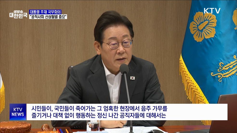 김용민 앵커>이재명 대통령이 제32회 국무회의를 열어 공직사회 '신상필벌'을 강조했습니다.김현지 앵커>재난 상황에서 음주 가무를 즐기거나 대책없이 행동하는 공직자는 엄격히 단속하라고 지시했는데요.이혜진 기자가 보도합니다.이혜진 기자>(제32회 국무회의)이재명 대통령이 주재한 제32회 국무회의는 신임 장관들의 인사말로 시작됐습니다.이 대통령은 신임 장관들에게...