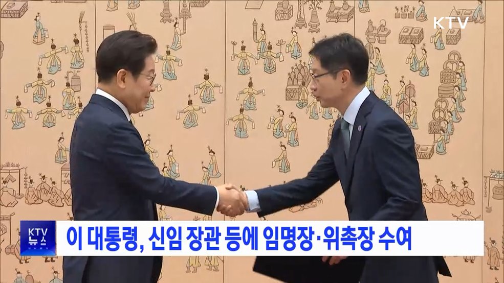 김유영 앵커>이재명 대통령이 오늘 용산 대통령실에서 구윤철 경제부총리 겸 기획재정부 장관 등 신임 장관 9명과 장관급인 지방시대위원장에 각각 임명장과 위촉장을 수여했습니다.이 대통령은 참석자들에게 잘 부탁한다며 축하 인사를 했고, 배우자들에게도 꽃다발을 전했습니다.앞서 이 대통령은 18개 부처 장관 가운데 국회에서 인사청문 보고서가 채택된 장관 9명의 임명...