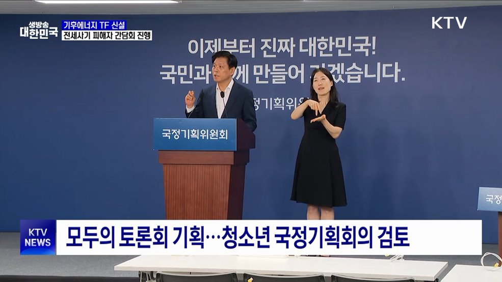 김용민 앵커>국정기획위원회가 기후에너지 관련 국정 과제를 조율할 TF를 만듭니다.김현지 앵커>전세사기 관련 국정과제 이행 계획을 수립하기 위한 간담회도 개최합니다.윤현석 기자의 보도입니다.윤현석 기자>새 정부의 기후에너지 관련 정책을 중점적으로 논의할 기후에너지 TF가 국정기획위원회에 새롭게 마련됩니다.TF에는 경제1분과와 2분과, 사회2분과, 외교안보분과...