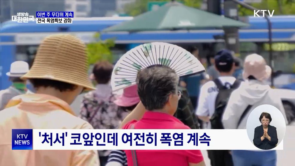임보라 앵커>더위가 물러간다는 절기상 '처서'가 코앞인데도 전국에 폭염특보가 발효 중입니다.이번 주도 불볕더위가 예고된 만큼 건강 관리에 각별히 유의하셔야겠습니다.김유리 기자가 보도합니다.김유리 기자>힘차게 뿜어져 나오는 물줄기 사이를 넘나들며 신나게 뛰어놉니다.30도를 웃도는 찜통더위 속, 도심 내 분수는 아이들에게 오아시스입니다.더위가 물러가고 모기도 ...