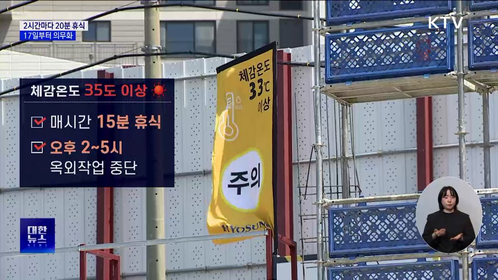 모지안 앵커>정부가 오는 17일부터 폭염 상황에서 작업하는 근로자에게 휴식을 의무화합니다.체감온도 33도 이상인 작업장에서는 근로자에게 2시간마다 20분 이상 휴식을 부여해야 합니다.임보라 기자입니다.임보라 기자>최근 경북 구미의 아파트 공사 현장에서 베트남 국적의 근로자가 숨진 채 발견됐습니다.발견 당시 기온은 37도, 체온은 40도 이상이었습니다.녹취>...