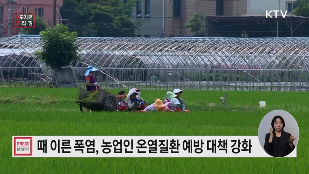 임보라 기자>국정을 더 촘촘히 살펴봅니다.보도자료 브리핑입니다.올해 이른 폭염이 찾아오면서 농업인들의 건강에 대한 우려가 커졌는데요.13일 기준 전국 응급실에 신고된 온열질환자 중 17%가 농업 분야 환자였습니다.대부분 60세 이상 고령층이었고, 전년보다 2.2배나 증가했습니다.이에 농촌진흥청이 '여름철 농업인 온열질환 예방 대책'을 토대로 현장 밀착형 대...