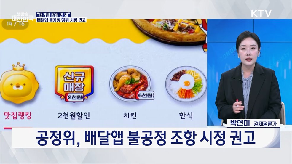 임보라 앵커>급격히 커져가는 배달 시장과 달리 팔아도 팔아도 손해를 보는 소상공인이 많다는 사실 아십니까?공정거래위원회가 불공정 약관부터 손을 보기로 했는데요.관련 내용 박연미 경제평론가와 살펴봅니다.(출연: 박연미 / 경제평론가)Q. 배달앱 불공정 약관 사례는?Q. 불공정 약관 시정 권고 내용은?