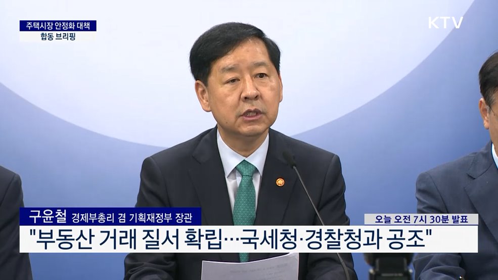 주택시장 안정화 대책 합동 브리핑구윤철 / 경제부총리 겸 기획재정부 장관 (오늘 오전 7시 30분 발표)김윤덕 / 국토교통부 장관윤창렬 / 국무조정실장이억원 / 금융위원장임광현 / 국세청장(장소: 정부서울청사 브리핑룸)