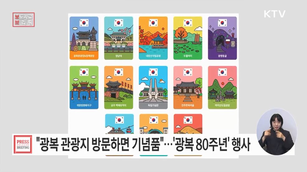 임보라 기자>국정을 더 촘촘히 살펴봅니다.보도자료 브리핑입니다.올여름, 광복 80주년을 맞아 광복의 의미를 되새길 수 있는 관광지 방문해 보시면 어떨까요?문체부가 '관광으로 기억하는 광복 80주년 행사'를 진행합니다.이달 11~17일 독립기념관 등 광복 관련 관광지 13곳을 방문하면 선착순으로 광복 기념 자석을 받을 수 있는데요.자석에는 일장기 위에 태극기...
