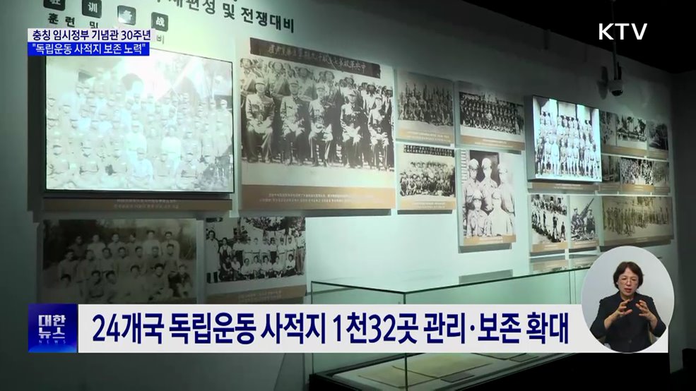 모지안 앵커>광복절을 앞두고 충칭 대한민국 임시정부 청사 기념관 30주년 기념식이 현지에서 개최됐습니다.정부는 독립운동 사적지에 대한 보존활동을 활성화한다는 방침인데요.국내 독립운동 현충 시설 1천여 곳도 전수 점검하기로 했습니다.박지선 기자입니다.박지선 기자>1919년 상하이에서 수립된 대한민국 임시정부.항저우, 창사, 광저우 등을 거쳐 광복을 맞기 직전...