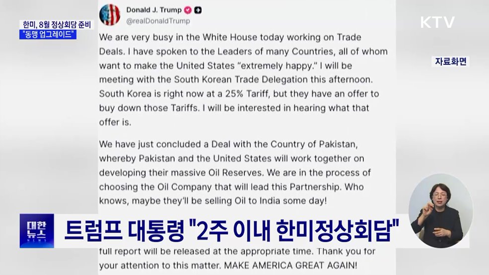 김경호 앵커>첫 한미 정상회담이 이달 말 열릴 것으로 전망됩니다.회담의 핵심 의제는 양국이 직면한 안보 현안이 될 것으로 보입니다.이혜진 기자입니다.이혜진 기자>한미 양국은 지난달 31일 관세 협상이 타결된 후 이재명 대통령과 트럼프 대통령의 첫 한미 정상회담 일정을 조율해왔습니다.앞서 트럼프 대통령이 협상 타결 직후 SNS에 당시 기준으로 2주 내 이 대...
