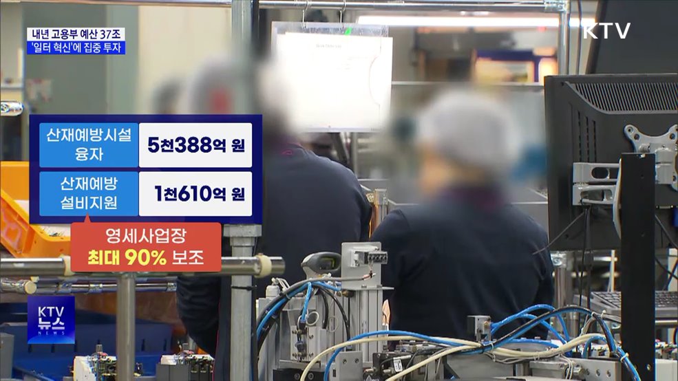 김유영 앵커>정부가 내년 고용노동 분야 예산으로 37조 6천억 원을 배정했습니다.일터 혁신에 재정을 집중 투자하기 위해 올해보다 2조 3천억 원을 증액했습니다.김경호 기자입니다.김경호 기자>고용노동부의 내년 예산은 산업 안전 등 일터 혁신 분야에 재정을 집중 투자합니다.우선 사업장의 산재 예방 시설 마련을 돕기 위해 정부 융자로 5천3백억 원을 투입합니다....