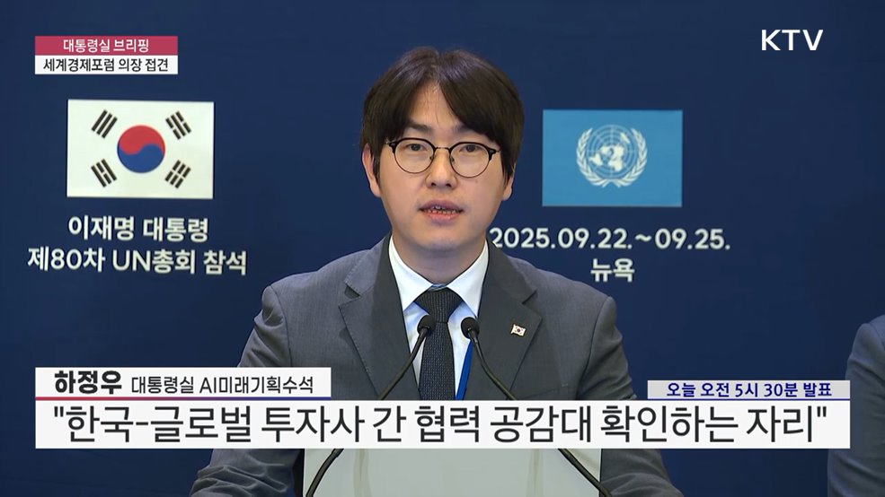 대통령실 브리핑 - 세계경제포럼 의장 접견하정우 / 대통령실 AI미래기획수석 (오늘 오전 5시 30분 발표)(장소: 뉴욕 프레스센터)