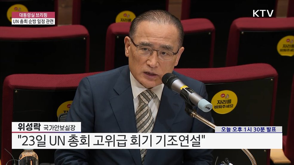 대통령실 브리핑 - UN 총회 순방 일정 관련위성락 / 국가안보실장 (오늘 오후 1시 30분 발표)(장소: 대통령실 대강당)