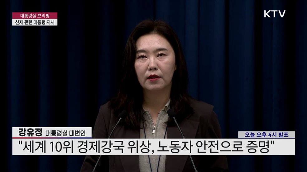 대통령실 브리핑 - 산재 관련 대통령 지시강유정 / 대통령실 대변인 (오늘 오후 4시 발표)(장소: 대통령실 브리핑룸)