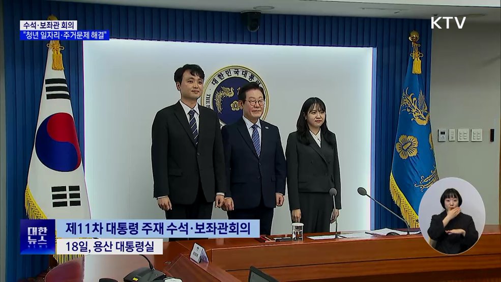 모지안 앵커>이재명 대통령이 수석·보좌관 회의를 열어 청년 대책을 집중 논의했습니다.이 대통령은 일자리·주거 문제 해결을 비롯해 청년들의 삶을 근본적으로 개선할 수 있는 대책을 추진하겠다고 밝혔는데요.이 소식은 이혜진 기자가 전하겠습니다.이혜진 기자>제11차 대통령 주재 수석·보좌관회의(장소: 18일, 용산 대통령실)이재명 대통령이 새로 채용한 청년담당관 ...