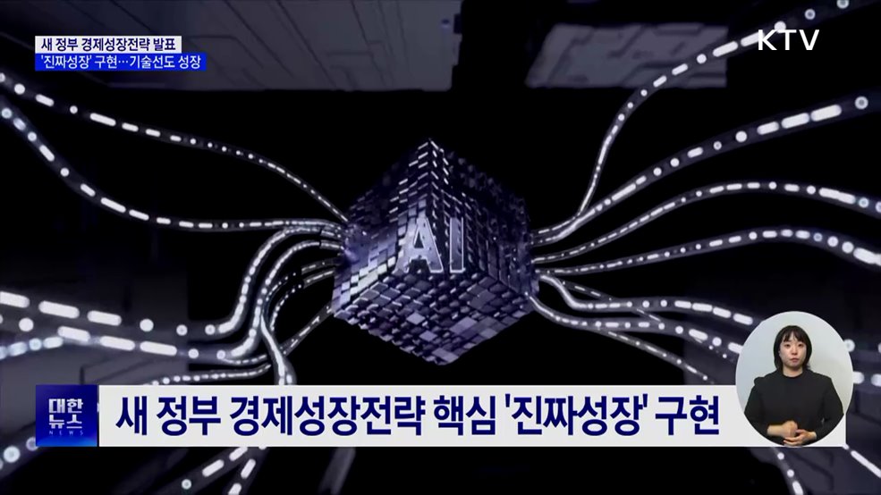 김경호 앵커>정부가 진짜 성장을 구현하기 위한 경제 성장 전략을 발표했습니다.AI 대전환 추진과 함께 초혁신 경제 선도 프로젝트를 통해 기술 선도 성장에 나서기로 했습니다.신국진 기자입니다.신국진 기자>새 정부 경제성장 전략의 핵심은 경제혁신으로 '진짜 성장' 구현입니다.AI 3대 강국 도약과 잠재성장률 3%, 국력 세계 5강 실현이라는 비전 달성으로 국가...