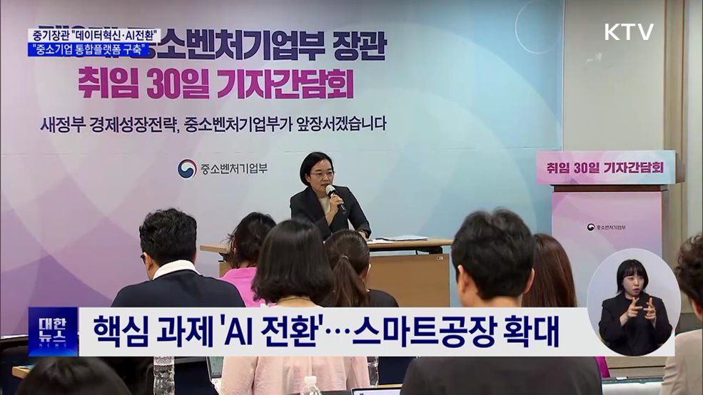 모지안 앵커>국내 기업의 99%는 중소기업입니다.이들 기업과 소상공인, 자영업자들을 지원하는 부처가 바로 중소벤처기업부인데요.한성숙 중소벤처기업부 장관이 취임 한 달 동안 데이터 혁신과 AI 전환 필요성을 느꼈다며, 이를 향후 핵심 과제로 제시했습니다.조태영 기자의 보도입니다.조태영 기자>한성숙 장관 취임 30일 기자간담회(장소: 28일, 중소기업중앙회)I...