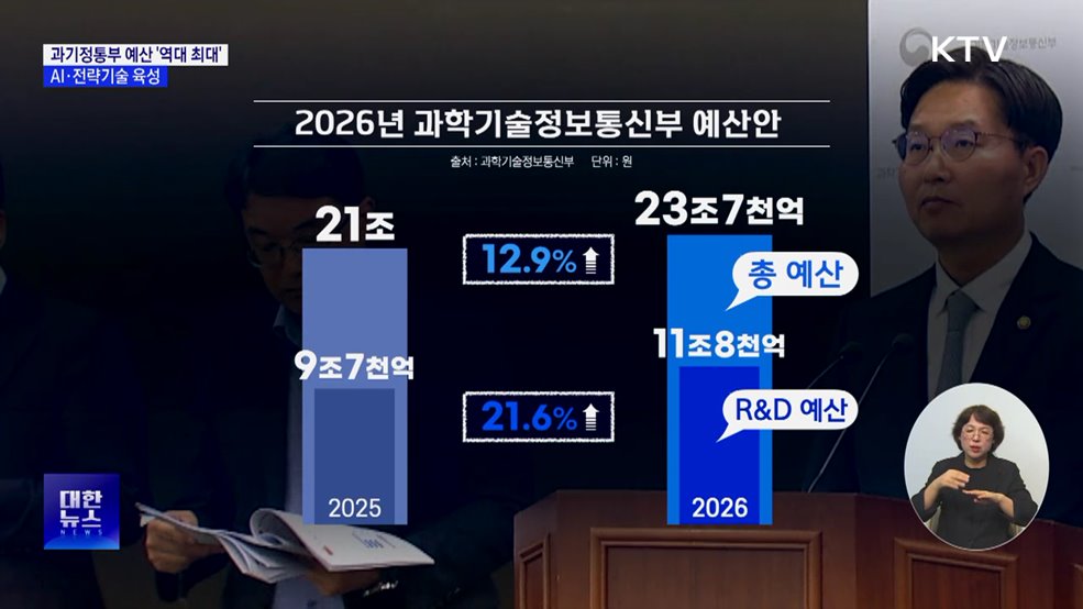 모지안 앵커>지금부터 내년 정부 예산안 살펴보겠습니다.정부의 확장 재정 방침에 따라 부처별 예산도 역대 최대 규모를 기록했는데요.과학기술정보통신부는 내년 예산으로 23조 7천억 원을 편성해 인공지능과 전략기술 투자에 집중하기로 했습니다.김유리 기자입니다.김유리 기자>과학기술정보통신부가 AI 대전환과 과학기술 생태계 회복이라는 정부의 정책방향을 고려한 내년도...