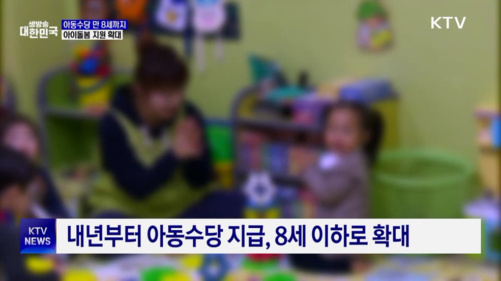 김용민 앵커>한 달에 10만 원씩 지급하고 있는 아동수당을 내년부터는 만 8세까지 받을 수 있습니다.김현지 앵커>아이돌봄서비스를 지원받을 수 있는 대상도 늘어나는데요.저출생 문제에 대응하기 위한 정부의 내년도 예산안을 이리나 기자가 정리했습니다.이리나 기자>전국의 7세 이하 모든 아동에게 월 10만 원씩 지급되고 있는 아동 수당이 내년부터 8세 이하로 확대...