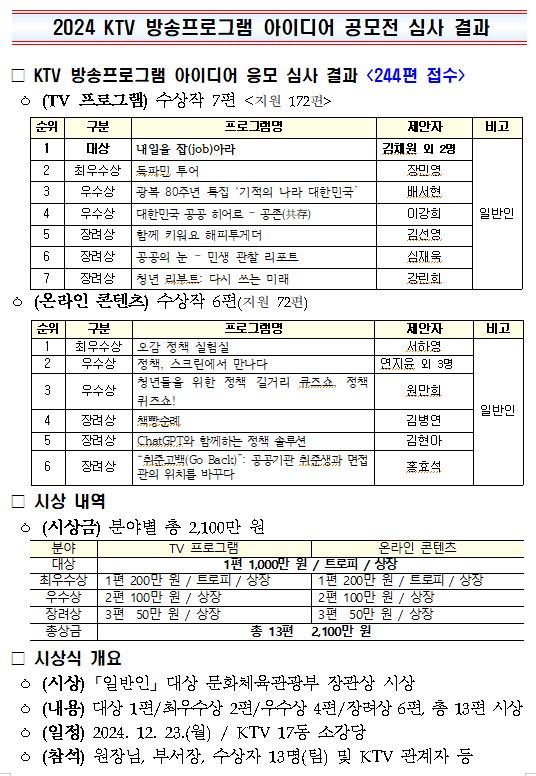 2024 KTV 방송프로그램 아이디어 공모전 응모 결과