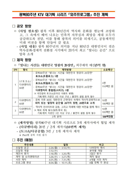 광복80주년 KTV 대기획 시리즈 제작사 모집 공고