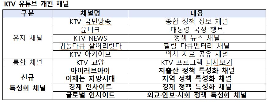 또한 50만 구독, 누적 조회수 4억 7천만 명을 자랑하는‘KTV 국민방송’, 대통령의 국정 행보를 가장 먼저 확인할 수 있는 ‘윤니크’, 실시간 정책 뉴스 채널 ‘KTV NEWS’, 귀농 정보와 자연을 담은 치유(힐링) 다큐멘터리 채널 ‘귀농다큐 살어리랏다’ 채널의 콘텐츠를 재편하고 KTV가 제작한 모든 프로그램을 다시 볼 수 있는 ‘KTV 교양’, KTV가 가진 가치 높은 영상자료를 언제 어디서나 즐길 수 있는 ‘KTV 아카이브’ 채널을 재조정함으로써 콘텐츠 경쟁력 강화를 통한 정책 정보 대표 채널로서 위상을 이어갈 예정이다.