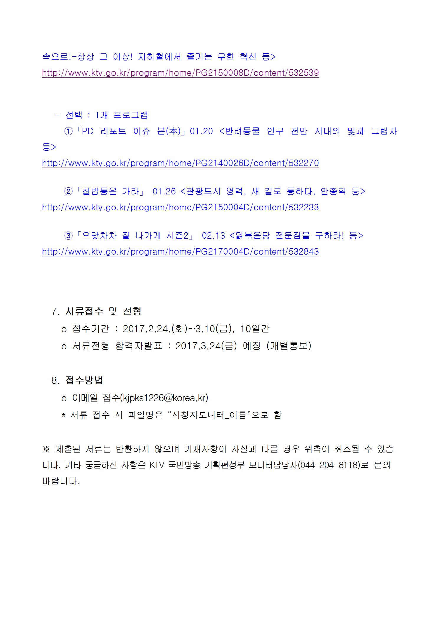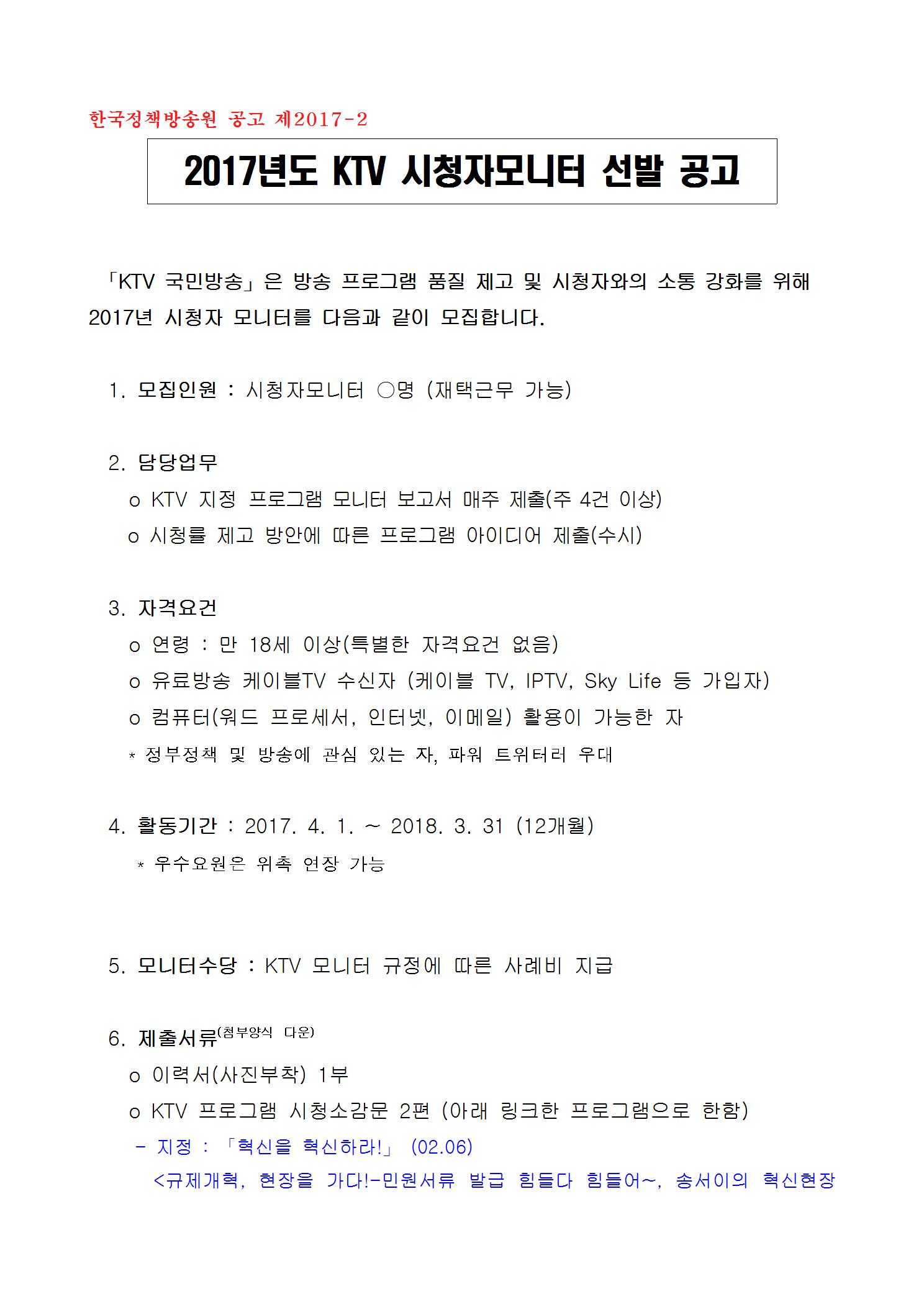 「KTV 국민방송」은 방송 프로그램 품질 제고 및 시청자와의 소통 강화를 위해 2017년 시청자 모니터를 다음과 같이 모집합니다.