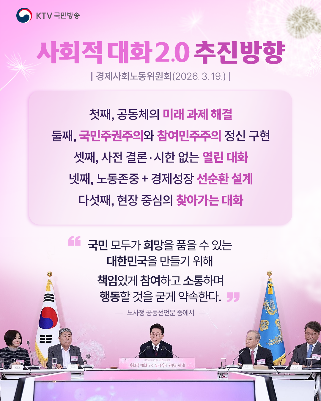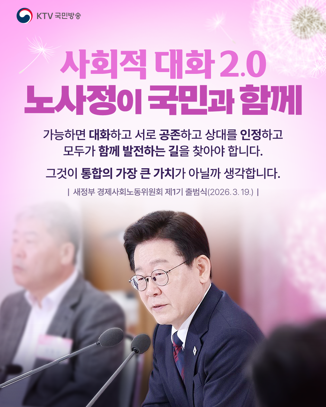 이 대통령은 “우리 사회 전반을 보면 실제로 우리 국제적 또는 대내외적 환경이 매우 어려운 상황인데 이런 때일수록 대화하고 타협하고 하나의 길을 갈 필요성이 점점 더 커진다”라며 사회적 대화의 필요성을 강조했습니다.