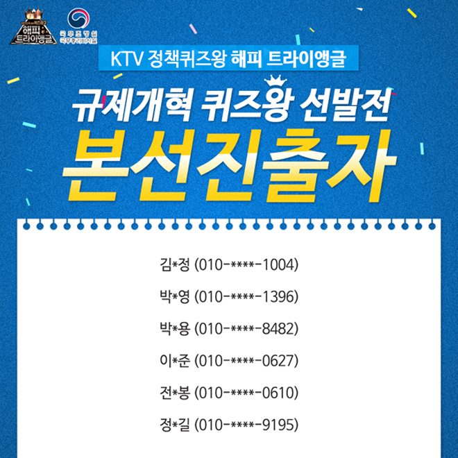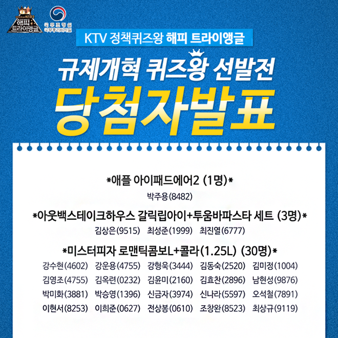 KTV 정책퀴즈왕 ‘해피 트라이앵글’ 규제개혁 퀴즈왕 선발전 이벤트에 참여해주신 모든 분들께 감사드립니다.