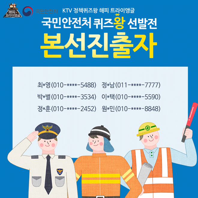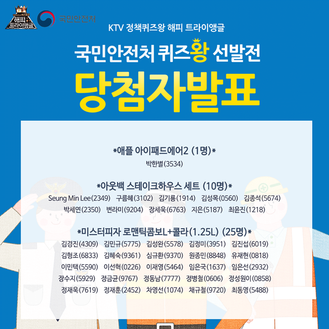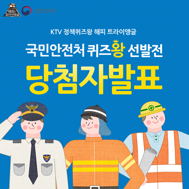 <KTV 정책퀴즈왕 ‘해피 트라이앵글’  국민안전처 퀴즈왕 선발전 이벤트>에  참여해주신 모든 분들께 감사드립니다.